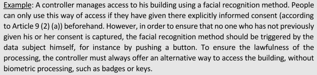 Grazie a tali linee guida si chiarisce molto bene come comportarsi nel caso si vogliano implementare soluzioni di riconoscimento facciale biometrico, anche grazie a esempi pratici di buona condotta, come quello di seguito riportato: