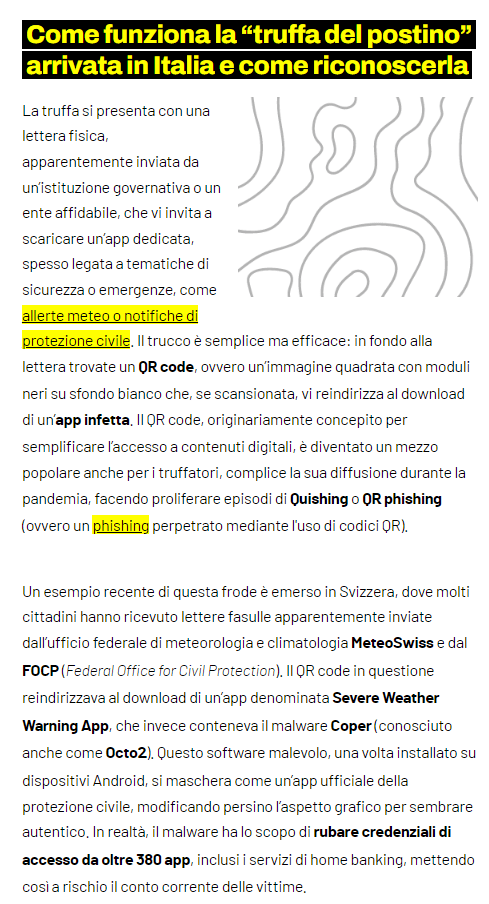 Di recente è stata pubblicata la notizia di una sua evoluzione, che anche Geopop illustra bene qui: l’invio di false lettere di Poste italiane, su carta intestata contraffatta con dovizia di dettagli, che spingono l’utente a fidarsi e inquadrare il QR Code. Prestare attenzione e ricordarsi che nessun soggetto pubblico o di pubblico servizio chiede di fornire dati per l’uno o l’altro motivo o accedere ai dati.